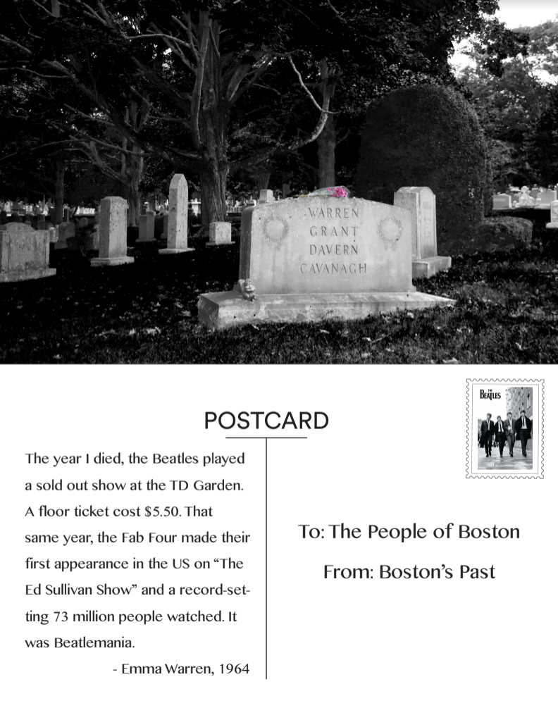 How are we honored after death? What memories of us are left behind? How much does the world change without us, after we’re gone? This series of postcards captures the essence of life after death -- showing us how the monuments of our memory are interacted with for years after we’re gone. The written notes contextualize us and reminds us of Boston’s rich history, showing us how the city has evolved and diversified over time. The noir photos in contrast with the individual color emphasizes the ephemerality of livelihood, even in areas that seem so void of life, at the surface.