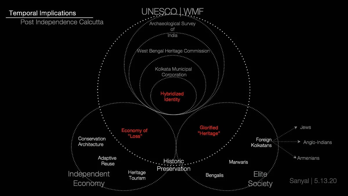 In this thesis, I investigate how and why the Bengali Bhadralok utilize historic preservation to assure the global recognition of their elite status and Calcutta’s colonial past. I’ve chosen this lens of analysis because the institution of preservation authorizes the Bengali Bhadralok to perpetuate the conceptions of value and narratives of power that originated during the British colonial project and gifted them their standing. My thesis reveals the legacies of loss and conflicted nationalism that shape Calcutta’s Bengali, elite socio-spatial identity. Through my work I observed a Bengali Bhadralok paradoxical imaginary — one driven by the simultaneous protection of the city’s colonially entangled urban condition and embrace of both the nation’s postcolonial status and global aspirations.